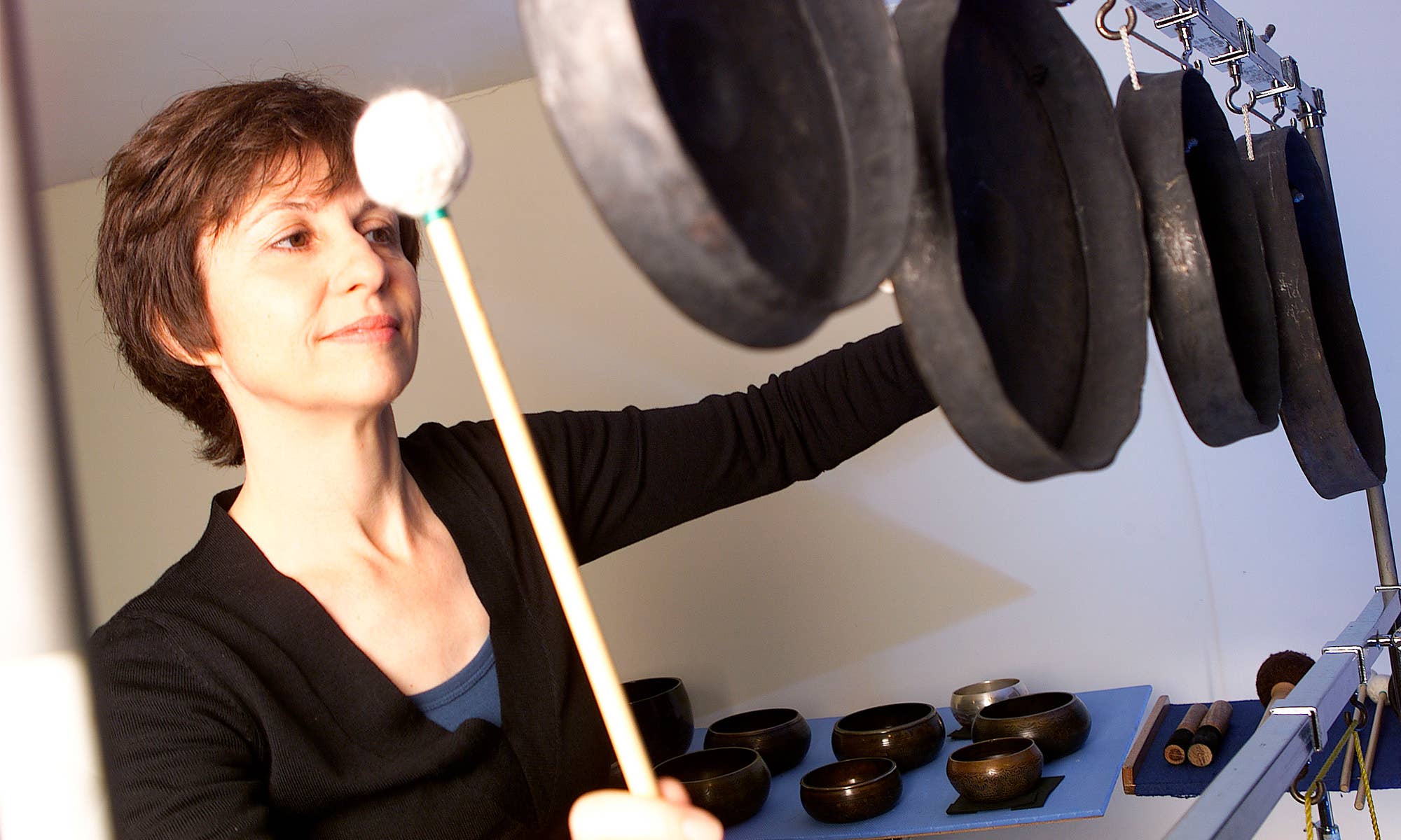 As she takes us on a tour – gongs over here, marimba here, cast iron frying pans she bought from a kitchen supply store here – she makes the point that, unlike traditional concertos written for one single instrument, percussion concertos are written for the entire family of instruments at once. Because of this, much of Lagos and Westlake’s collaboration on this project has been working out what is physically possible to play.